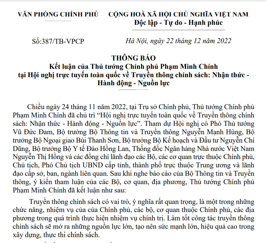 Thông báo Kết luận của Thủ tướng Chính phủ Phạm Minh Chính tại Hội nghị trực tuyến toàn quốc về Truyền thông chính sách: Nhận thức - Hành động - Nguồn lực