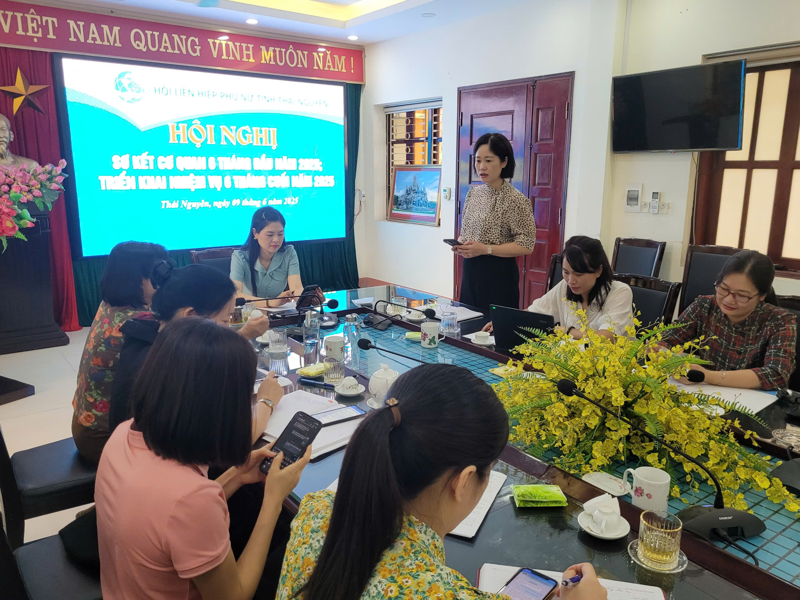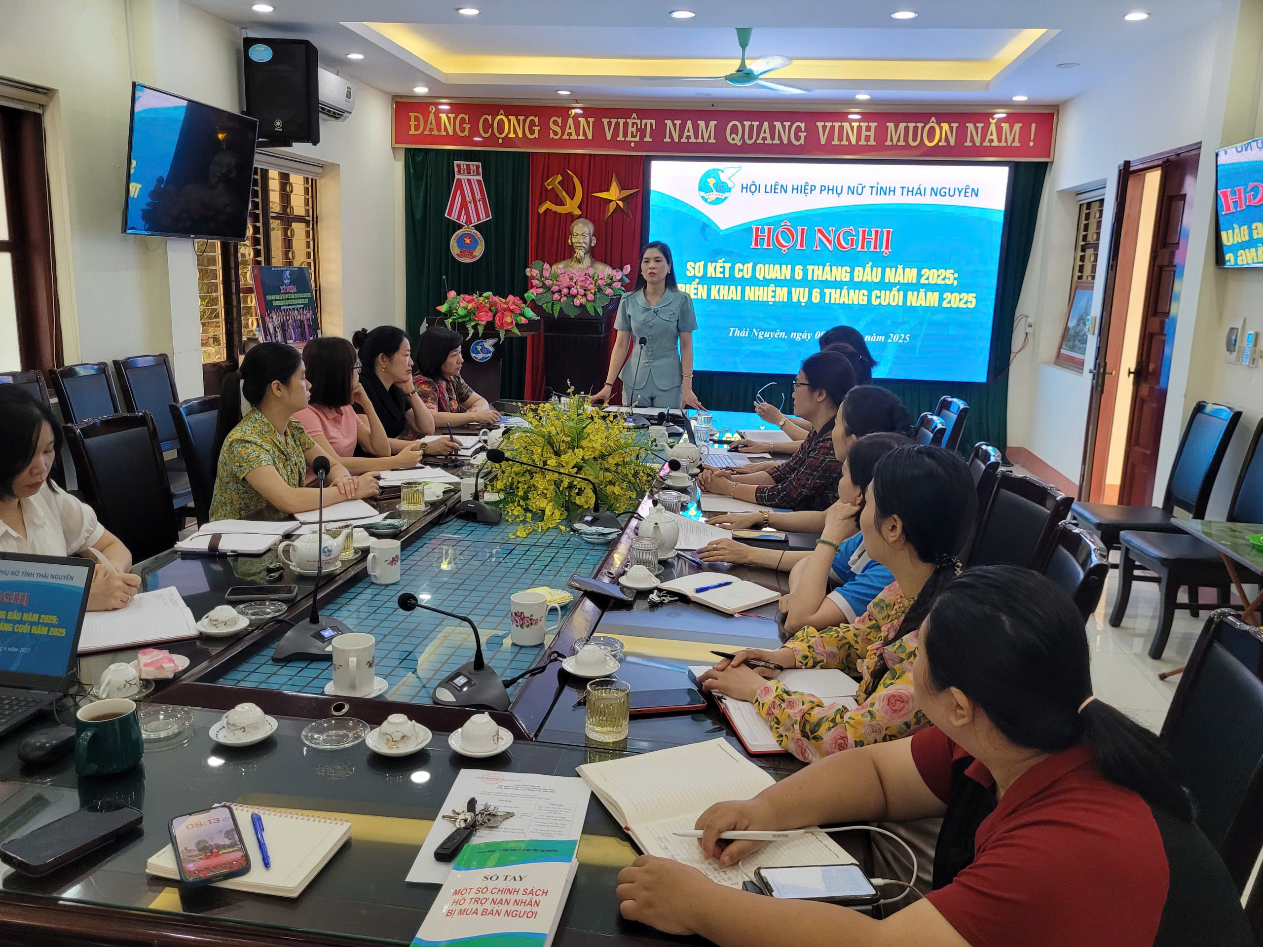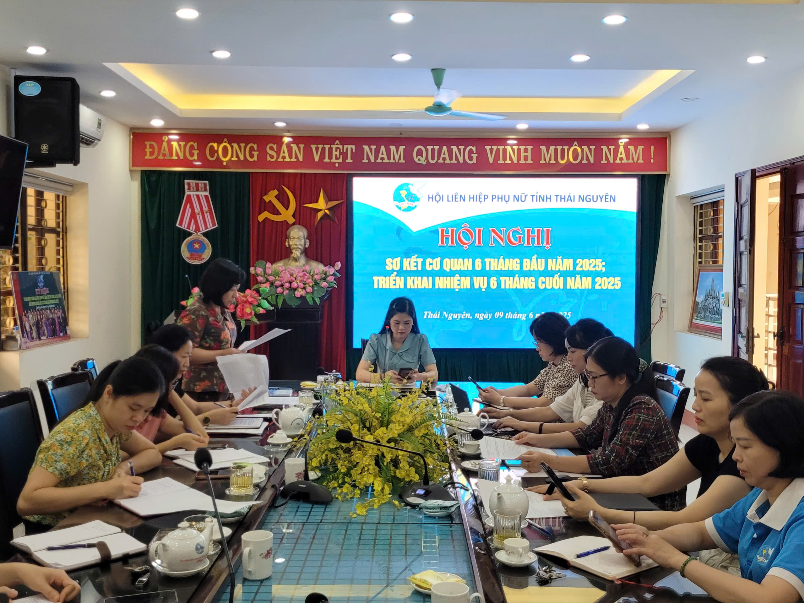 Thực hiện chương trình công tác năm 2025, sáng ngày 09/6/2025, cơ quan Hội Liên hiệp Phụ nữ tỉnh Thái Nguyên đã tổ chức Hội nghị sơ kết công tác 6 tháng đầu năm và triển khai nhiệm vụ 6 tháng cuối năm 2025. Dự và chủ trì Hội nghị có đồng chí Phạm Thị Thu Thủy – Ủy viên Ban Chấp hành Đảng bộ tỉnh, Thủ trưởng cơ quan Hội LHPN tỉnh. Tham dự Hội nghị có các đồng chí Thường trực Hội, Trưởng, Phó các ban chuyên môn cùng toàn thể cán bộ, công chức, người lao động cơ quan.