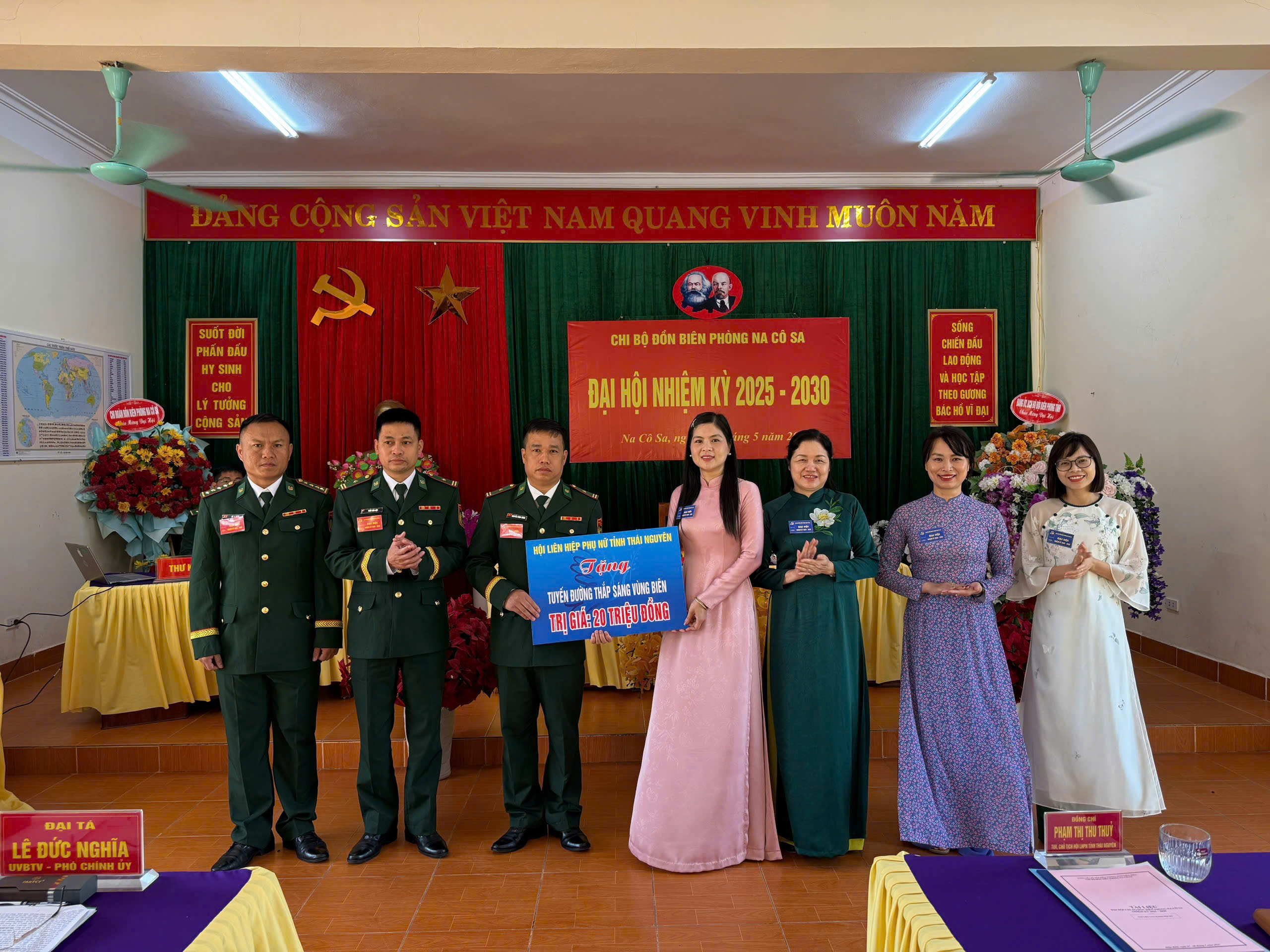 Trong khuôn khổ chuyến công tác, Đoàn đã tham dự Đại hội Chi bộ Đồn Biên phòng Na Cô Sa nhiệm kỳ 2025-2030; đồng thời phối hợp với Đồn tổ chức các hoạt động ý nghĩa trong chương trình “Đồng hành cùng phụ nữ biên cương” tại địa bàn xã Na Cô Sa. Hội LHPN tỉnh Thái Nguyên đã trao hỗ trợ xây dựng tuyến đường “Thắp sáng vùng biên”; thăm, tặng quà học sinh Trường Mầm non Na Cô Sa và Trường Mầm non Pa Tần, với tổng trị giá quà tặng gần 60 triệu đồng.