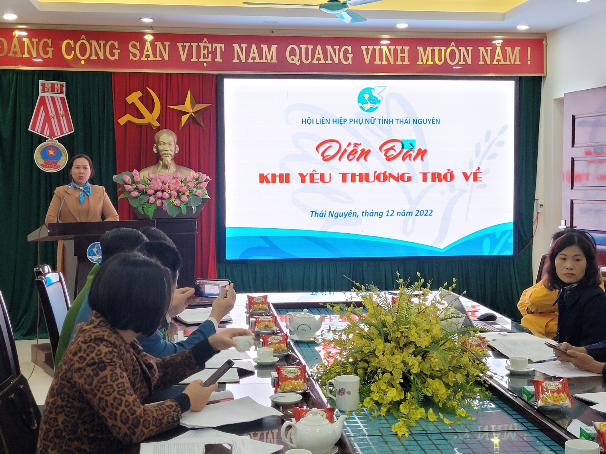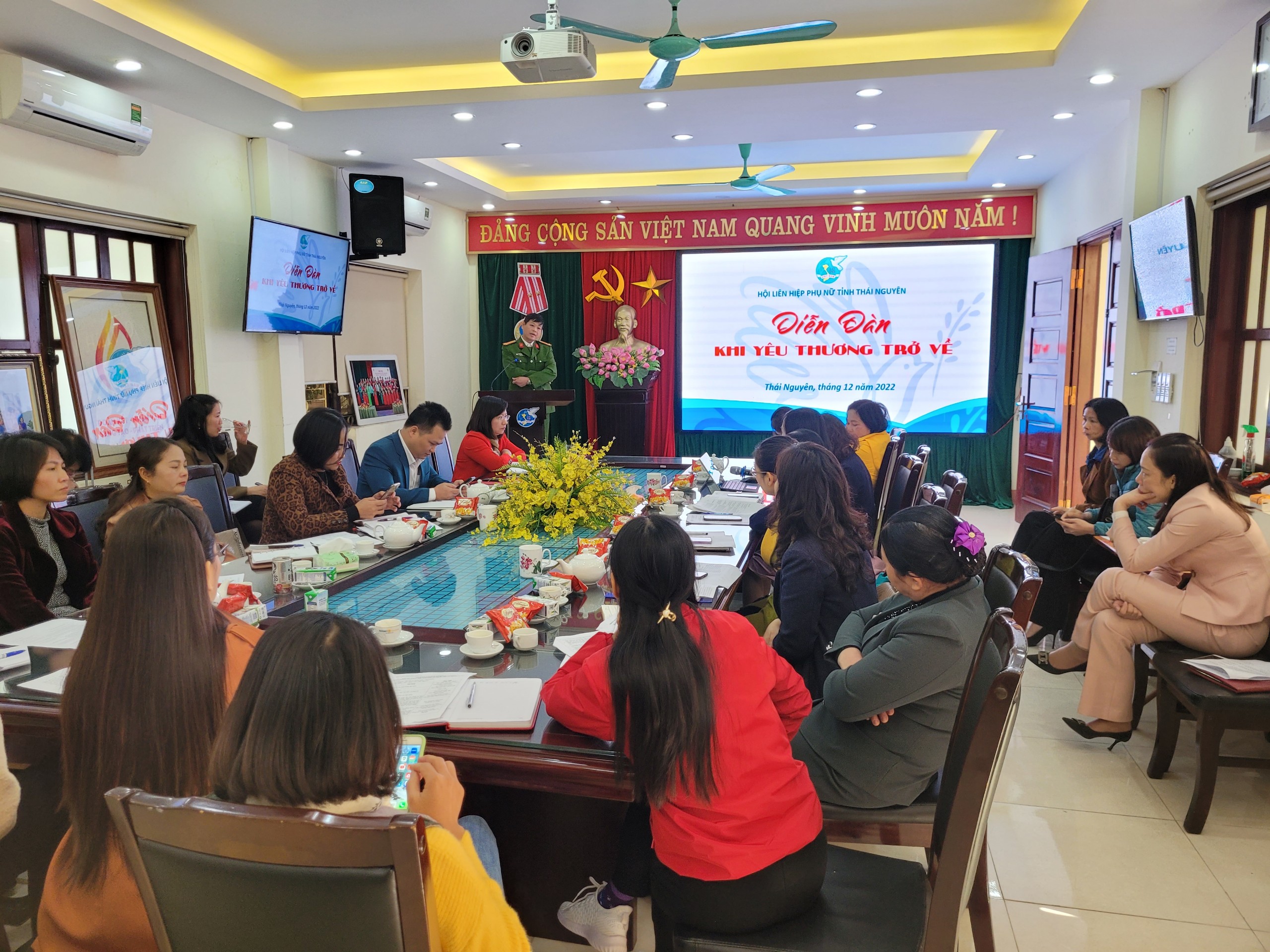 Ngày 15/12/2022, Hội LHPN tỉnh Thái Nguyên tổ chức Diễn đàn “Khi yêu thương trở về” nhằm tạo diễn đàn trao đổi, chia sẻ giữa nạn nhân bạo lực trên cơ sở giới, phụ nữ hoàn lương với các cơ quan, ban, ngành, đoàn thể và tổ chức Hội, để góp phần thực hiện hiệu quả Đề án 938 về “Tuyên truyền, giáo dục, vận động, hỗ trợ phụ nữ tham gia giải quyết một số vấn đề liên quan đến phụ nữ giai đoạn 2017-2027”. Dự và chỉ đạo Diễn đàn có đồng chí Trần Kim Dung- Phó Chủ tịch Hội LHPN tỉnh cùng các đồng chí đại diện Ban Dân vận tỉnh uỷ; Công an tỉnh; Sở Tư pháp; Sở Lao động, Thương binh và Xã hội, Sở Văn hóa, Thể thao và Du lịch; Lãnh đạp Hội LHPN 9/9 huyện, thành phố; Chủ tịch Hội LHPN một số xã, phường và phụ nữ là nạn nhân bạo lực trên cơ sở giới, phụ nữ hoàn lương.