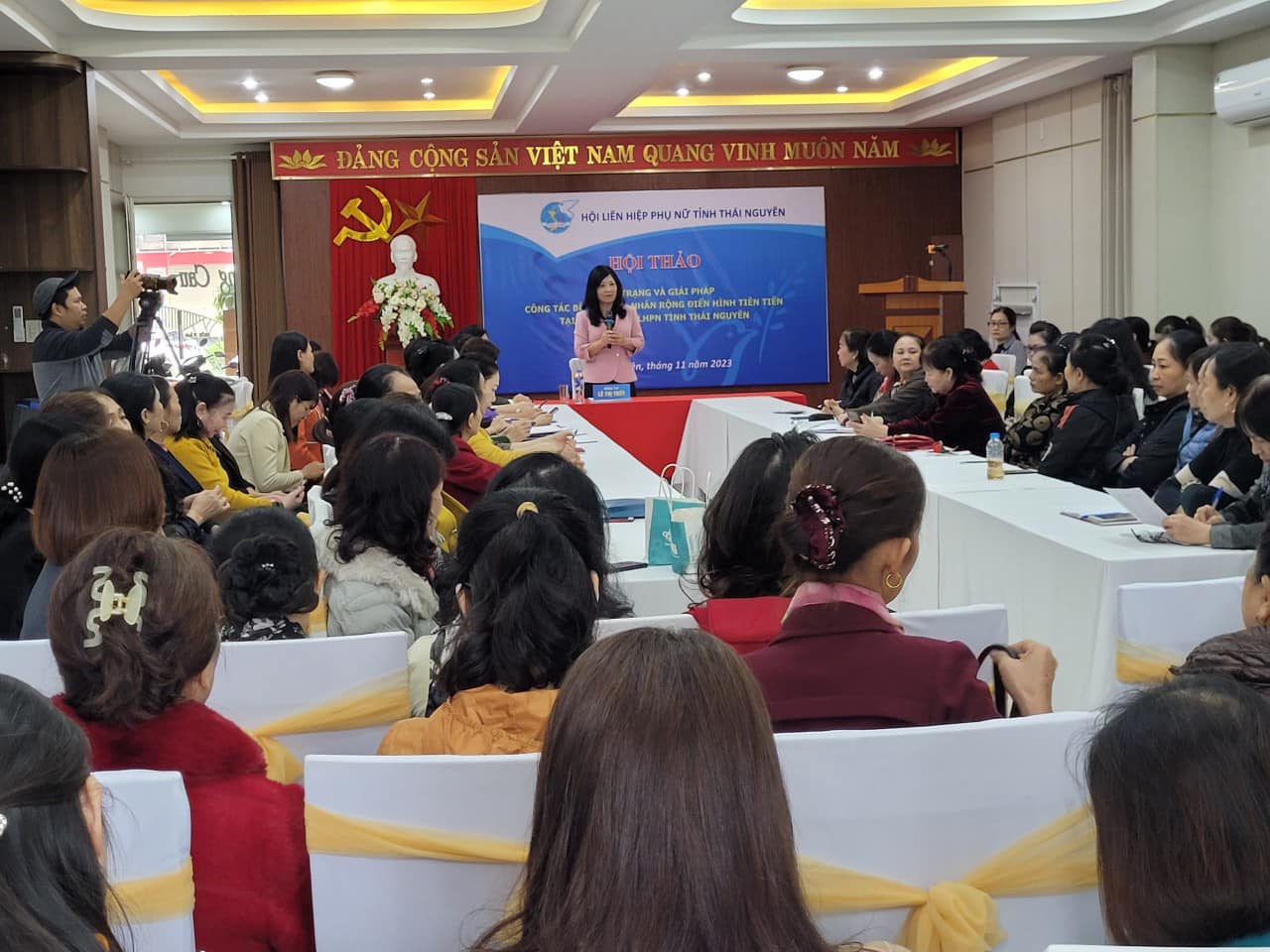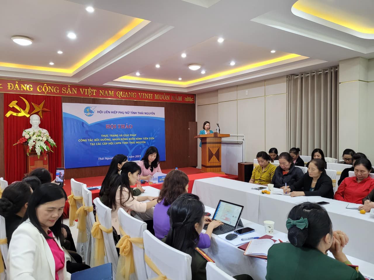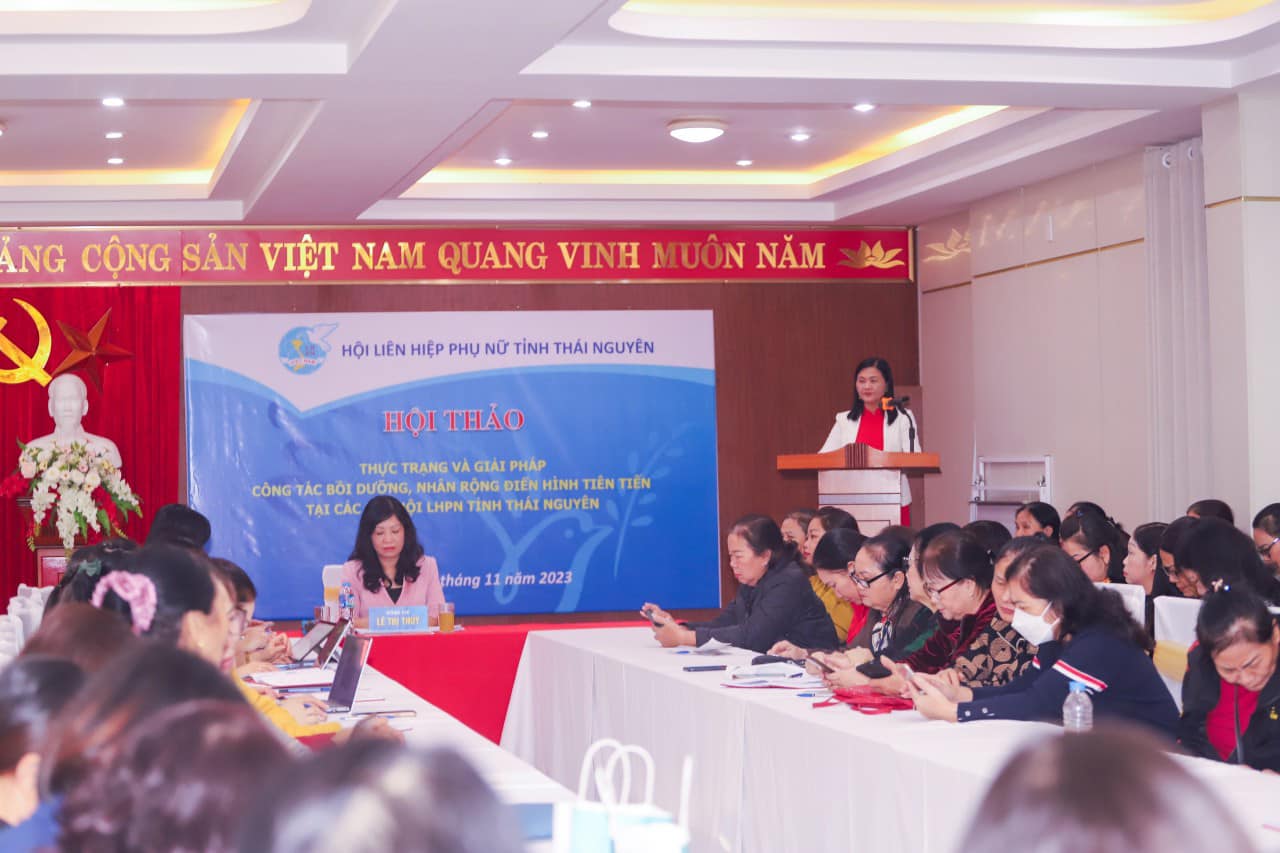 Thực hiện nhiệm vụ công tác Hội và phong trào phụ nữ năm 2023, ngày 23/11/2023 Hội LHPN tỉnh tổ chức Hội thảo “Thực trạng và giải pháp công tác bồi dưỡng, nhân rộng điển hình tiên tiến tại các cấp Hội LHPN tỉnh Thái Nguyên”. Dự và chủ trì Hội thảo có đồng chí Lê Thị Thuý- Phó Chủ tịch Hội LHPN tỉnh; các đồng chí là Chủ tịch, Phó Chủ tịch Hội LHPN cấp huyện và tương đương; cán bộ Hội LHPN cấp cơ sở và gần 200 hội viên nòng cốt tham gia.
