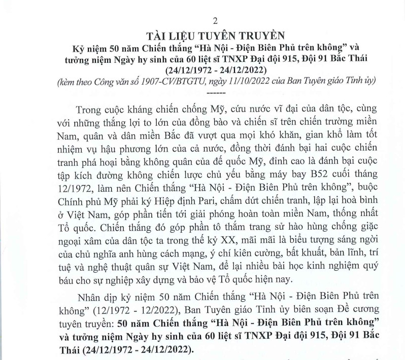 Tài liệu tuyên truyền Kỷ niệm 50 năm Chiến thắng "Hà Nội - Điện Biên Phủ trên không" và tưởng niệm Ngày hy sinh của 60 liệt sĩ TNXP Đại đội 915, Đội 91 Bắc Thái (24/12/1972-24/12/2022)