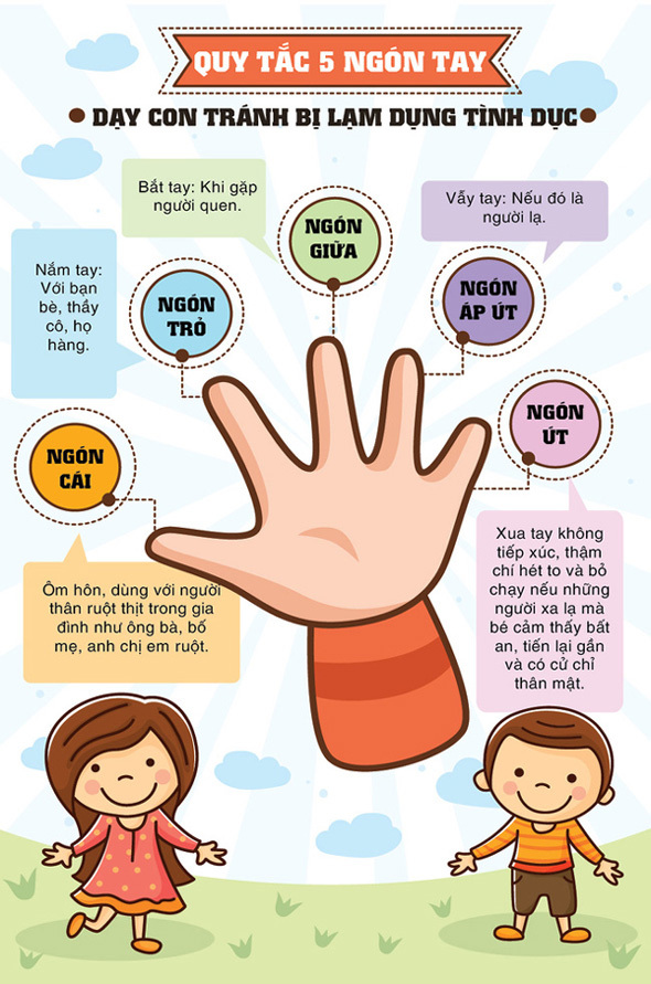 Để giúp trẻ tránh bị xâm hại tình dục, một trong những quy tắc bố mẹ có thể dạy con là "Quy tắc 5 ngón tay". Quy tắc này sẽ giúp trẻ có thể tránh xa những đối tượng nguy hiểm và bảo vệ chính bản thân mình. Cha mẹ có thể dạy con xác định được 5 nhóm người thường gặp trong cuộc sống hàng ngày, từ đó đưa ra định hướng giao tiếp phù hợp, giúp trẻ tránh bị lạm dụng, mua chuộc hay xâm hại tình dục.